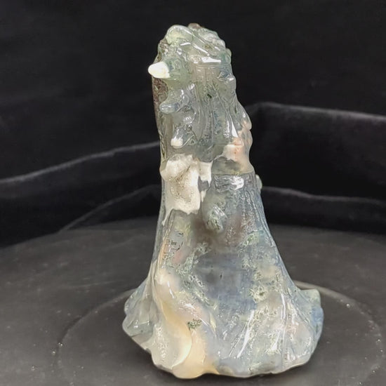 This Blue Moss Agate Goddess of the Wolf figurine has beautiful blue and green coloring as well as some gorgeous druzy pockets. This very detailed carving has amazing energy and you can definitely feel the natural pull of the Earth energy while holding her. She measures approximately 4" tall by 2 1/2" wide and weighs 248 grams.