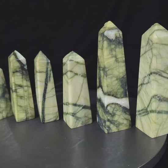 Beautiful hand-carved green and white Serpentine with Calcite in matrix towers.