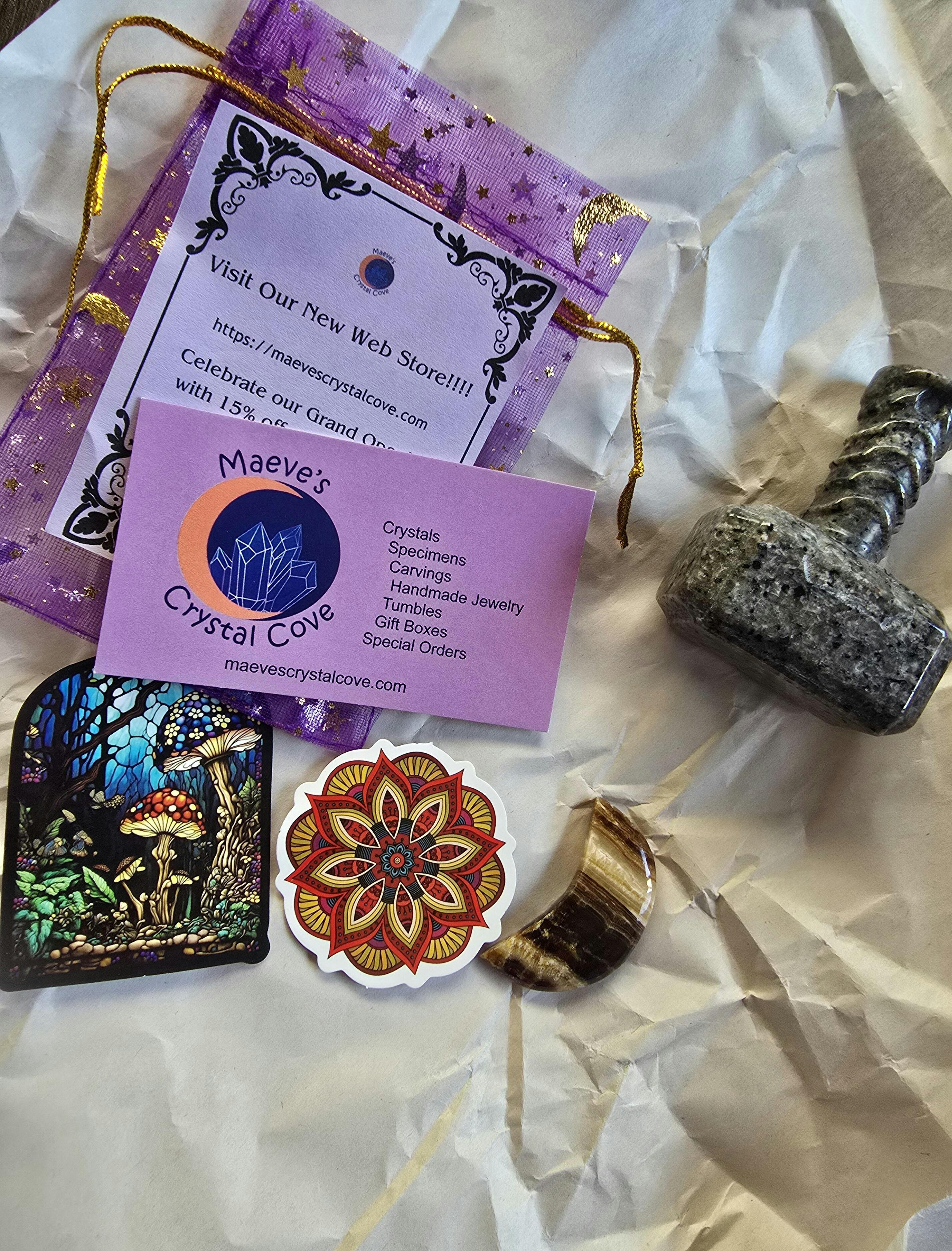 Please note that these hammers are hand crafted from natural stone/crystal, and as such may very well have chips, nicks, pits, cracks, etc. These are not flaws, only a reflection of the natural creation process.